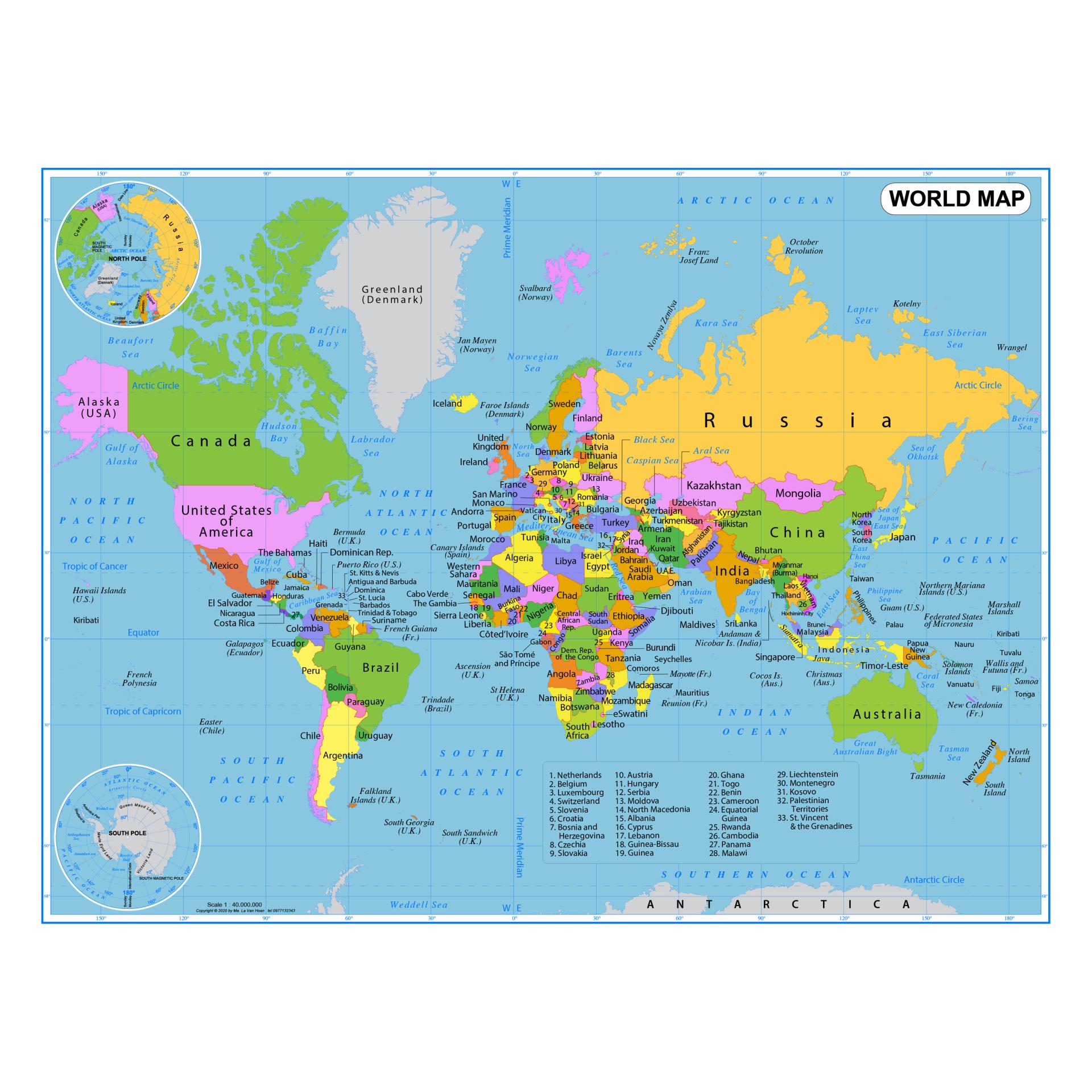 * Sản phẩm là một tờ Bản đồ thế giới, tiếng anh (tenQG) khổ A0, đã cán bóng nhiệt hai mặt.