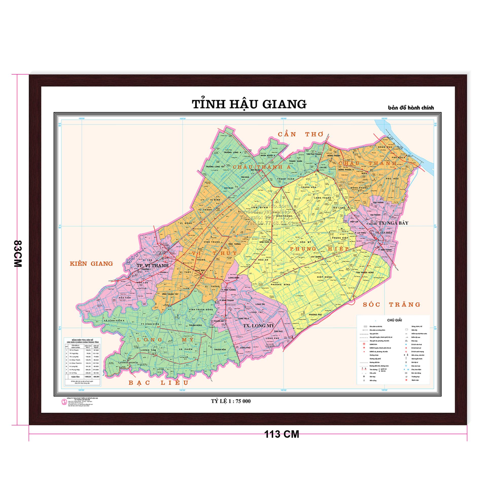 - Kích thước khung: 86 cm x 116 cm. Tỷ lệ 1 : 75.000, In và gia công năm 2023. Hiện chỉnh mới nhất đến thời điểm giao hàng.